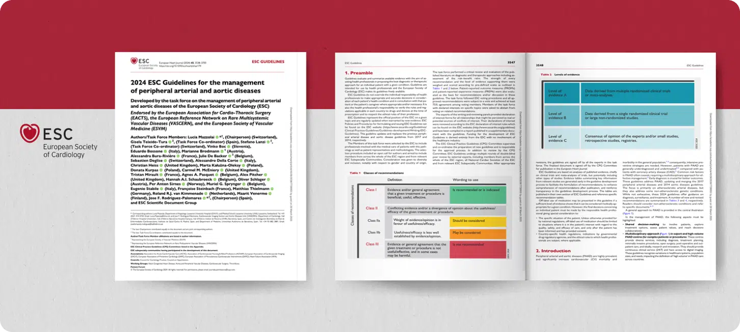 La Sociedad Europea de Cardiología (ESC) presenta esta nueva guía sobre el manejo de enfermedades arteriales periféricas y aórticas, desarrollada con la colaboración de expertos de diversas organizaciones médicas europeas.